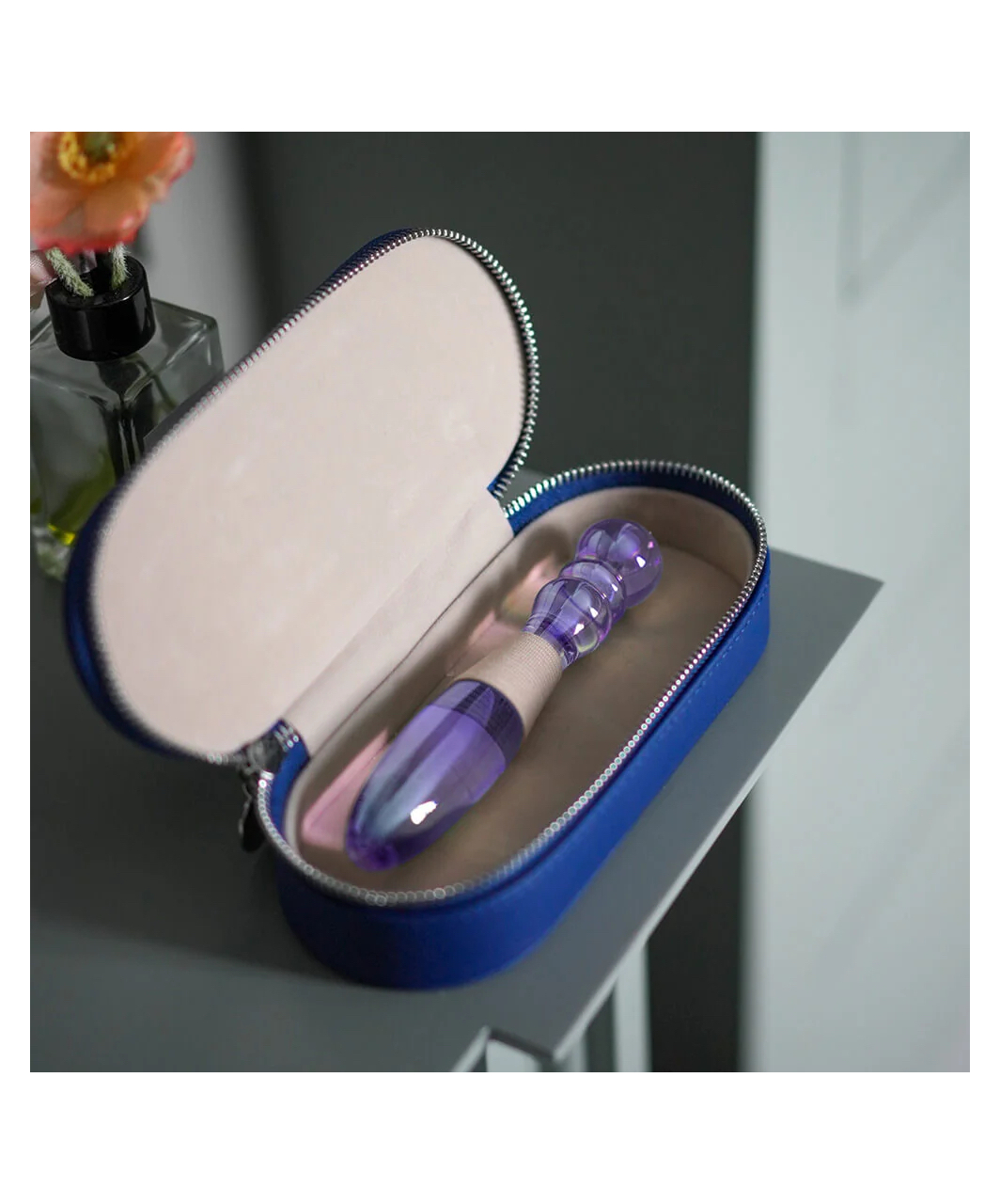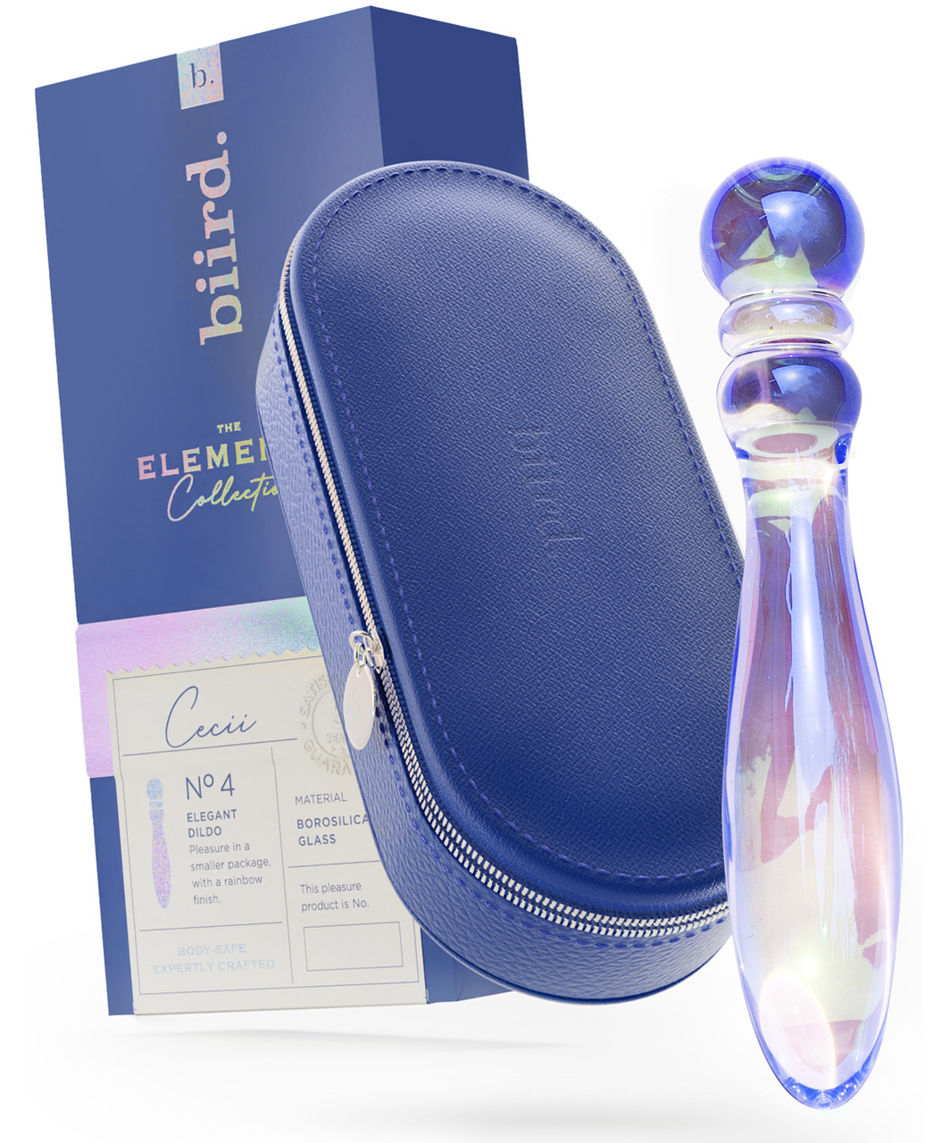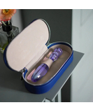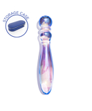 Iridescent glass dildo that can be used from both ends. Comes in a discreet blue faux leather storage case.