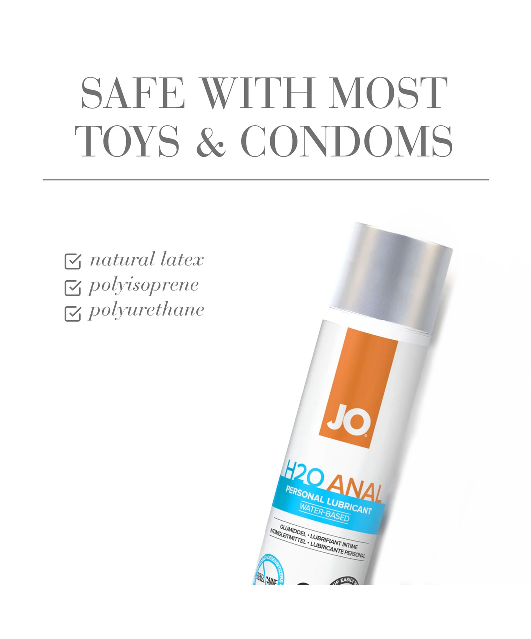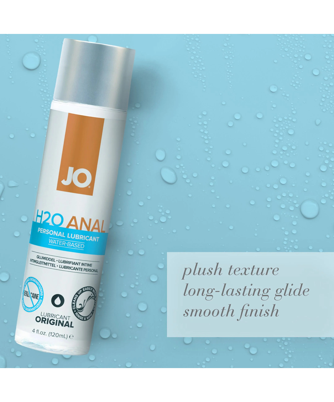 240 ml$ 35,08JO® H2O Anal is a water-based personal lubricant for penile, anal and/or vaginal application, intended to lubricate and moisturize, to enhance the ease and comfort of intimate sexual activity and supplement the body’s natural lubrication. This product is compatible with natural rubber latex, polyurethane, and polyisoprene condoms.