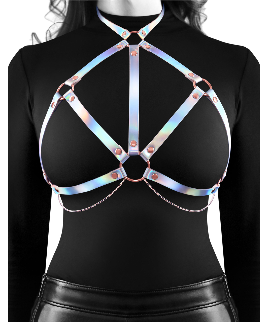 The Crave chest harness from Cosmo Bondage collection is the perfect addition to an extravagant look – an eye-catching outfit accessory, made of shiny vinyl with a holographic top and metallic details in rose gold. Fastens and adjusts in the back with strap buckles.