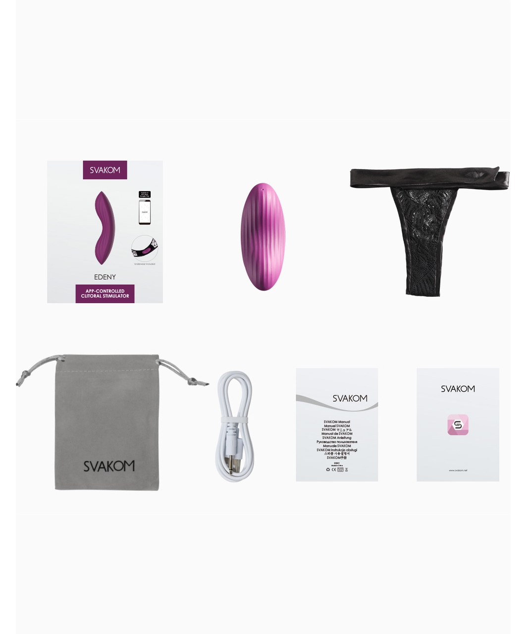 Purple, flexible mini vibrator made of silky-smooth and body-friendly material. It can be used as lay-on vibrator or can be placed inside the included black lace tie-side thong. Svakom Edeny is concave, thin and lightweight, it has a stimulating grooves. The toy will provide intense pleasure via mobile app. You can also ask your partner to participate, even if he or she is miles away. You can use the toy even without a mobile app – there are 11 manual modes of vibration at the push of a button. Although using the mobile app, you will be able to enjoy all kinds of vibrations: music rhythms, touches on the phone screen, etc. Edeny is completely waterproof – bring it to the bathtub or shower!