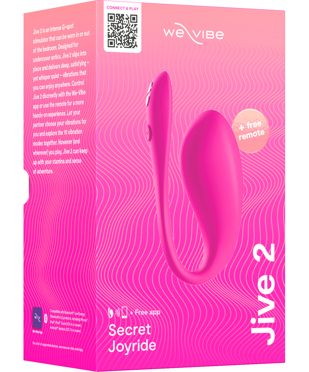 We-Vibe Jive 2 uses a Bluetooth connection and works with the We-Vibe App on Android 7.0 and iOS 14.0 or later. The mobile app is available for free on the Google Play and Apple App Store.