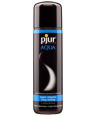 pjur AQUA. Water-based personal lubricant to relieve vaginal dryness. Suitable for use with condoms. Increases comfort during sex. Apply the desired amount to your penis and/or vaginal area. Suitable for sex toys. For everyday use. Compatible with latex and polyisoprene condoms. Avoid contact with the eyes and irritated skin. If irritation persists, consult a doctor. Keep out of reach of children. Not a contraceptive. Non-spermicidal. Slip hazard on smooth surfaces.