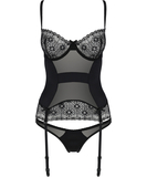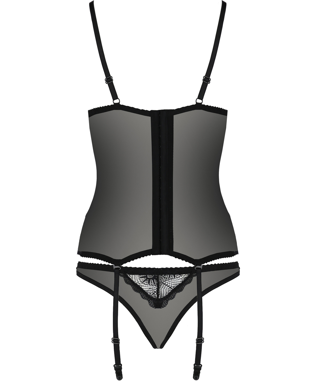 Mustast tüllist korsett koos satiinist ja pitsist detailise ja tugikaartega. Haagi ja silmusega sulgur seljal, õapaelad ja sukahoidja on reguleeritavad. Komplektis on sobivad stringid.