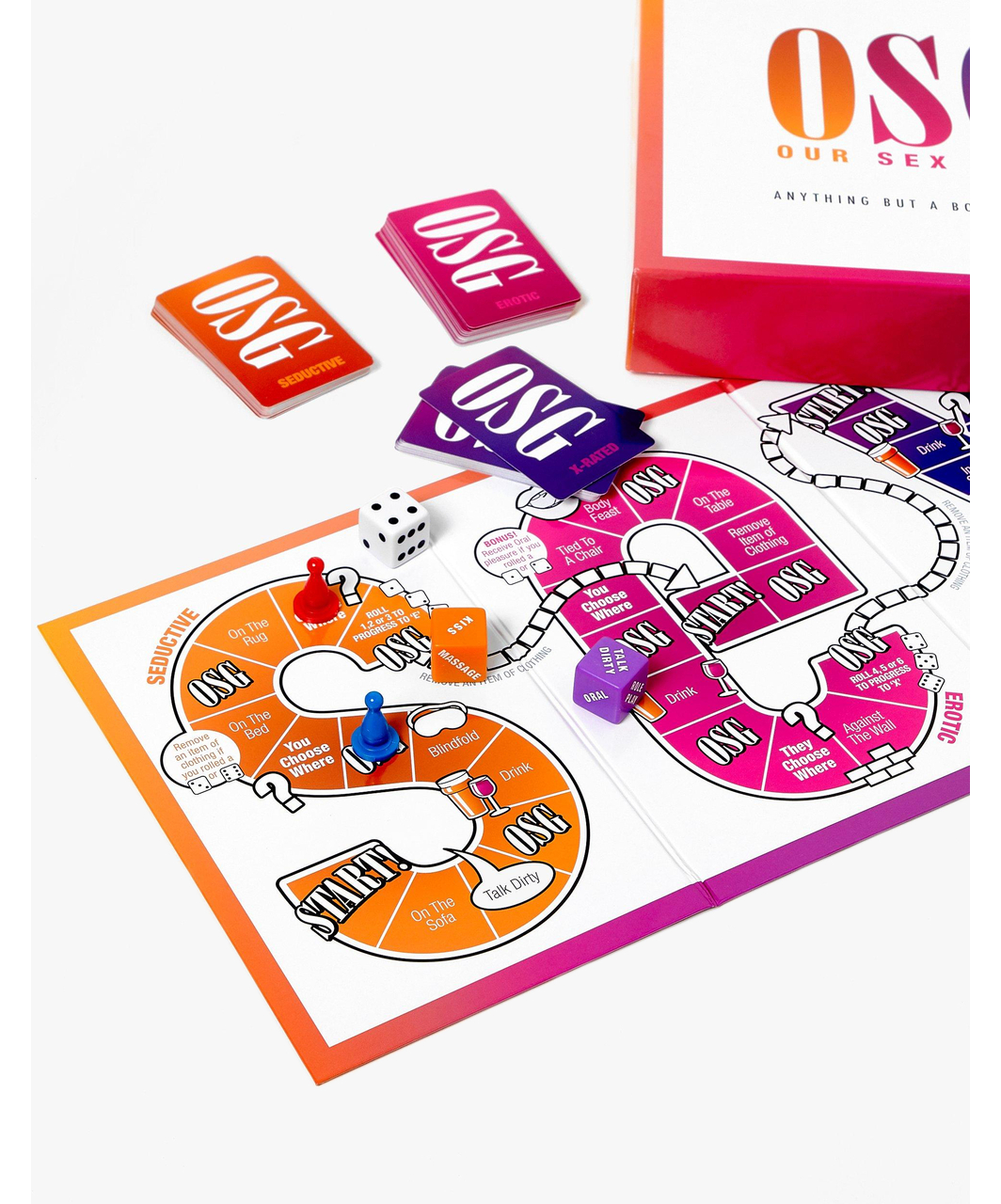 OSG: Our Sex Game annab juurdepääsu kõikidele valdkondadele, julgustades stimuleerivaid vestlusi, erootilisi avastusi ja eksperimenteerimist, mis ei jäta midagi puudutamata – sõna otseses mõttes! Mängulaual, kus on kirjas S E X, intensiivistub nauding ühelt tähelt teisele liikudes Võrgutavast Erootiliseks ja Pornografiliseks. Veeretage täringut, et teada saada, mida te tegema hakkate, kus te seda tegema hakkate ja kes autasu saab. Alustage, kirjutades salaja üles oma ülima seksuaalfantaasia ja mängige võidu nimel, sest sellest saab võitja auhind…