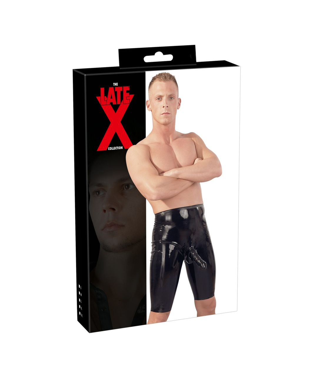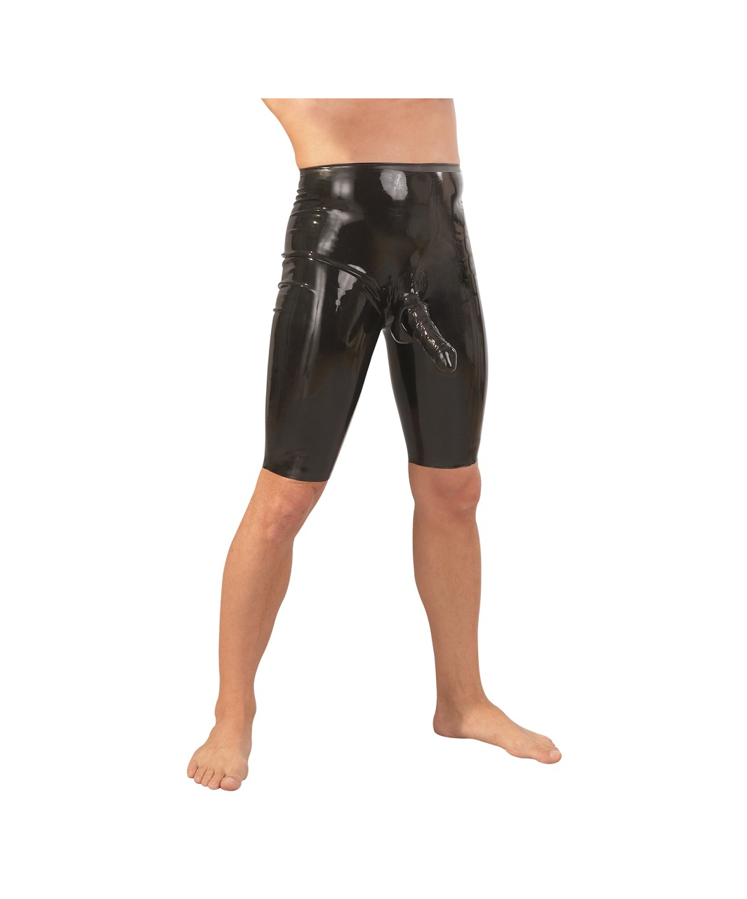 Musta värvi, väga liibuvad lateksi lühiksed püksid külgetöödeldud ümbrisega peenisele ja munanditele.