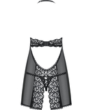 Must läbipaistev babydoll-kleit õhukesest läbipaistvast tüllist ja peenest pitsist, ahvatlevate väljalõigete ja piluga seljal. Dekoltee on kaunustatud dekoratiivpaelte ja valgete pärlitega. Kaela tagant kinnitatav pael ja haakkinnitus seljal on reguleeritavad. Komplektis on sobivad stringid.