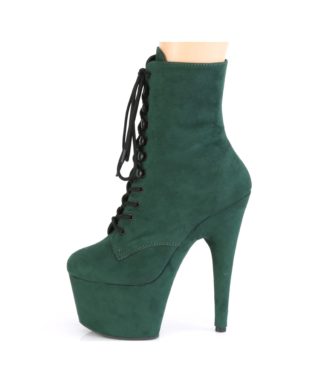 Smaragdrohelisest kunstseemisnahast kõrge platvormiga ja nööridega poolsaapad, stilettokonts, vinüülist sisetald ja täispikk tõmblukk siseküljel.