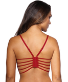 Punainen pitsinen olkaimellinen rintaliivi, jossa on kukkakirjonta ja underwire-kupit. Säädettävät olkaimet ja koukku- ja silmäsuljenta takana.