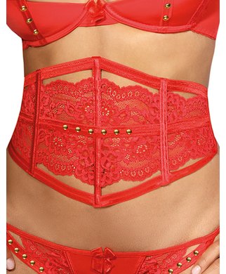 Punainen koristeellinen vyötärönauha, jossa on pitsiä ja kullanvärisiä yksityiskohtia. Säädettävä koukku- ja silmäsuljenta takana.