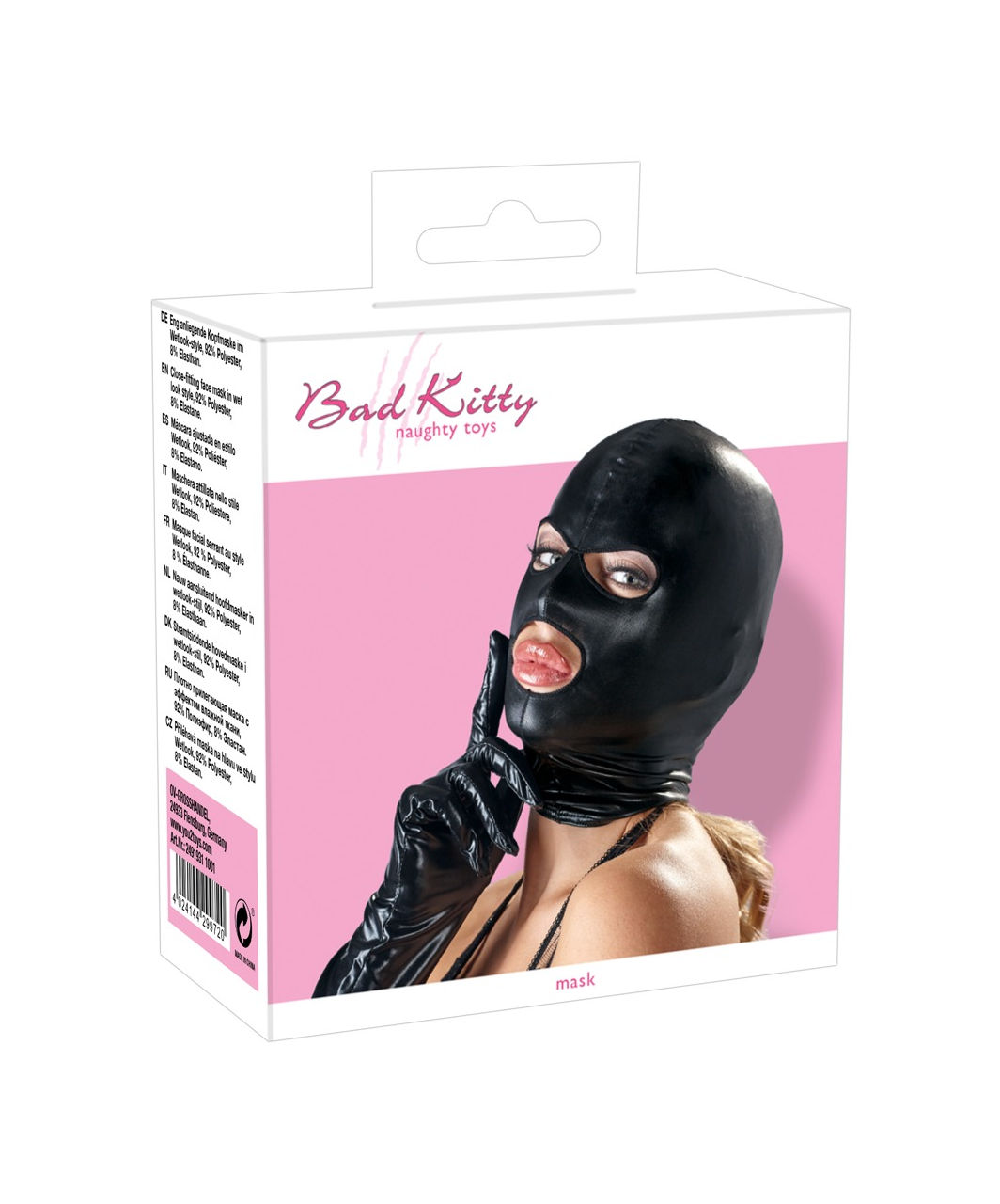Musta tiiviisti istuva päähine, joka on valmistettu kiiltävästä wet look -kankaasta. Reiät suuta ja silmiä varten. Kaulaosan ympärillä joustava helma. Yksi koko sopii useimmille.