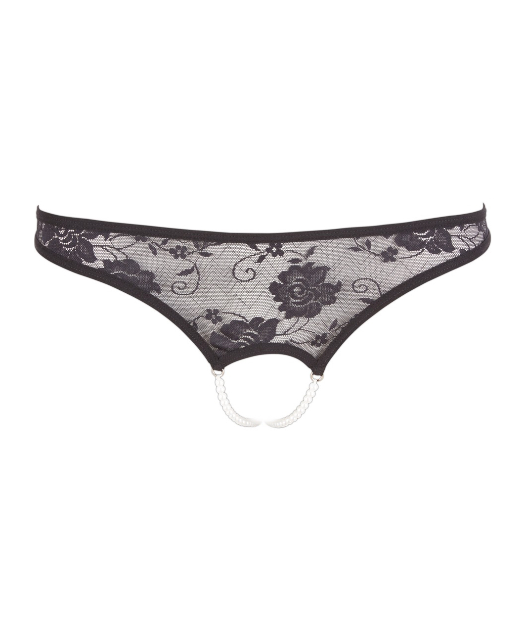 Mustat pitsiset powernet-verkkosukkahousut stringit, joissa on kaksi valkoista helminauhaa.