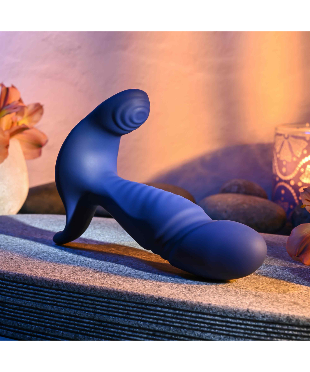 Tämä tummansininen eturauhasen stimulaattori tarjoaa miellyttävää eturauhasen hierontaa sen uritetun sisään työnnettävän osan ja 10 työnnettävän värähtelytilan avulla. Se on valmistettu silkkisen sileästä, vartaloystävällisestä silikonista, jonka pää liikkuu edestakaisin hieroen eturauhasta samalla kun se värähtelee. Sen ulompi osa stimuloi välilihaa. Värinä- ja työntömoodeja ohjataan pohjaan upotetulla painikkeella. Kokeile sitä myös kylpyammeessa tai suihkussa, sillä se on täysin vedenpitävä.