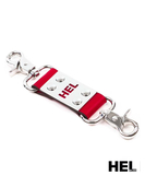 Liittimessä on metallinen niklattu HEL-logokilpi ja kaksi metallista nepparikoukkua.