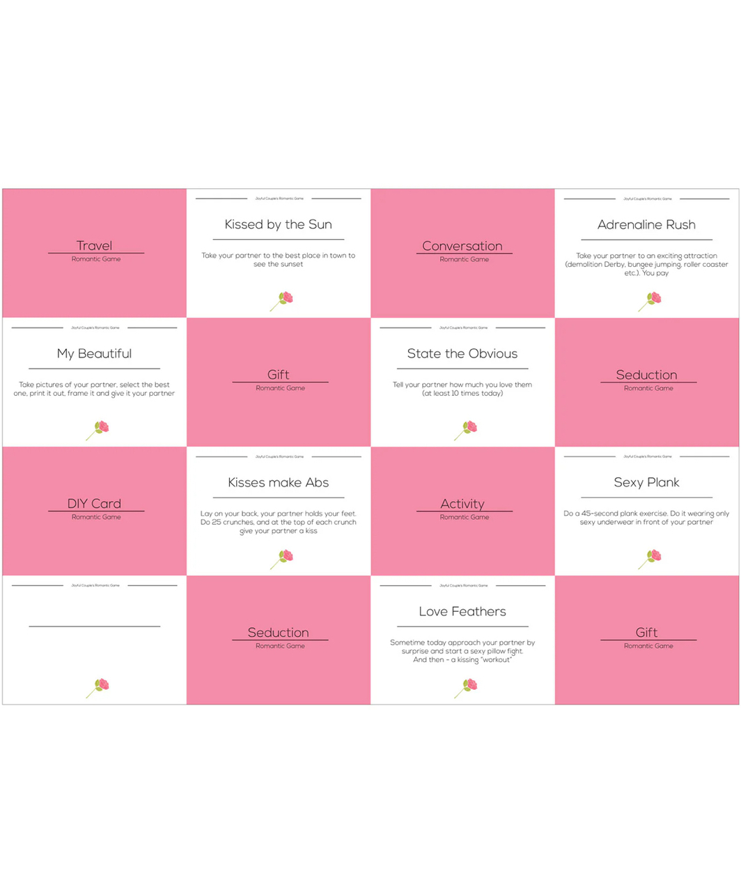 Tämä peli sisältää 50 aktiviteettia, jotka on lajiteltu 5 kategoriaan, jotta voit viettää ihastuttavaa ja intiimiä aikaa kumppanisi kanssa. Keskustelukortit tarjoavat lämpimän ja hellän alun, kun taas aktiviteettikortit antavat teille mahdollisuuden nauttia rakkaudellisista fyysisistä kokemuksista yhdessä. Matka- ja lahjaideat inspiroivat sinua tekemään jotain erityistä rakkaallesi, ja Viettelys-kortit auttavat sinua tutkimaan leikkisiä fantasioita, mikä tuo lisää maustetta romanttisiin hetkiinne.