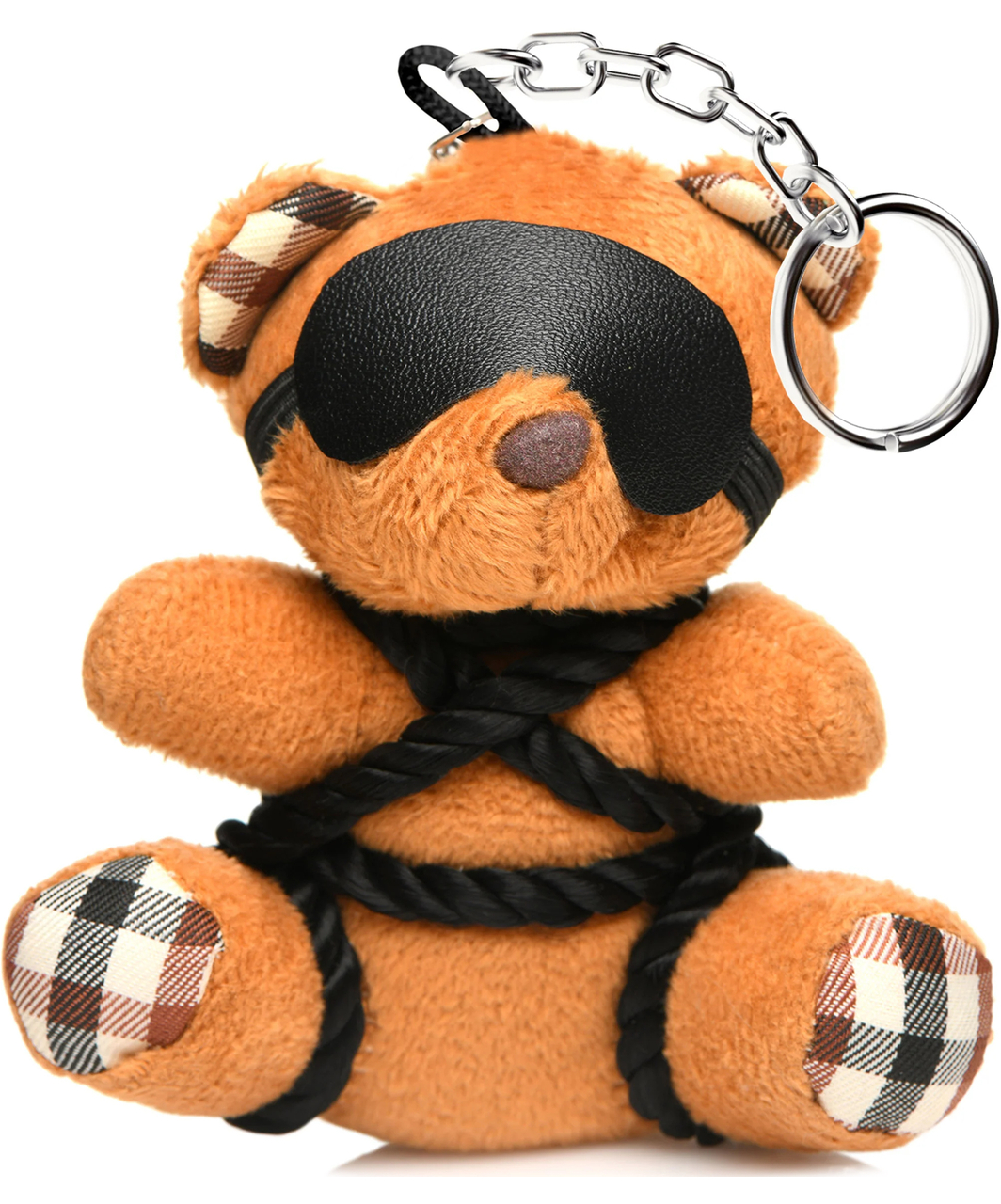 Mustalla köydellä sidotulla nallella varustettu avaimenperä, jossa on irrotettava keinonahkainen silmäside.