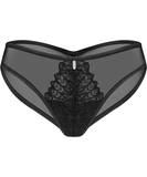 Mustat läpikuultavat verkkopöksyt, joissa on pitsiä edessä ja röyhelöitä takana.