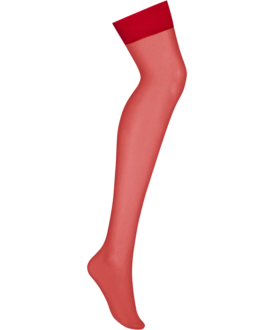 Punaiset läpikuultavat sukkanauhasukat. Ilman sukkanauhavyötä.