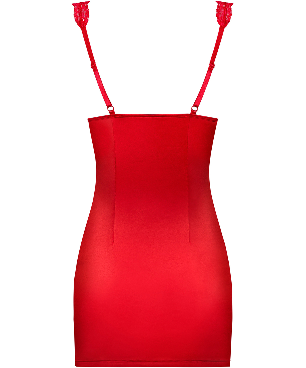Punainen, kiiltävä satiininen aluspaita, jossa on pitsiset sivuosat ja reunus. Halkiota koristaa rusetti. Hihnat ovat säädettävät. Sopiva stringi sisältyy hintaan.