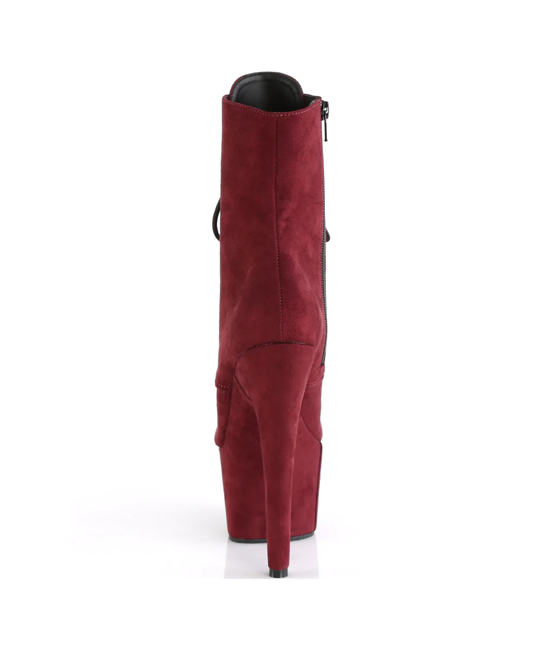 Burgundinpunaiset tekomokkanahkaiset nauhalliset nilkkurit, joissa on korkea koroke, korkokenkä, vinyylipohja ja sisäpuolinen vetoketju.