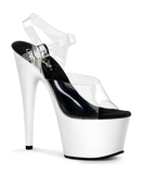 Valkoinen 17 cm:n korkokenkä, jossa on 7 cm:n koroke. UV-mustavaloefekti hehkuvissa neonväreissä. Kirkas nilkkahihna ja leveä yläremmi, jossa edessä neliönmuotoinen leikkaus.