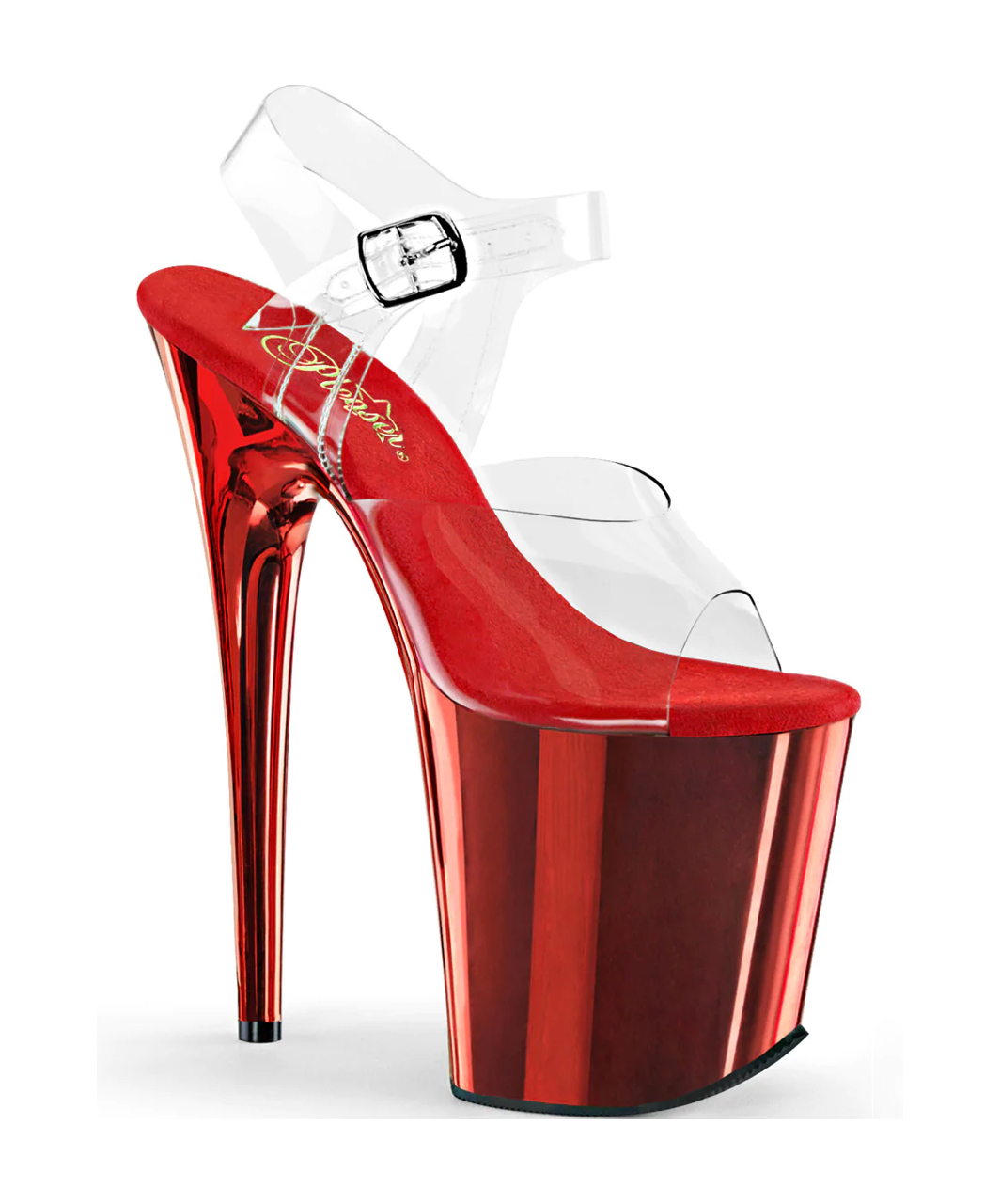 Transparentit vinyyliset avokärkiset nilkkahihnasandaalit, joissa on erittäin korkea punainen kromattu koroke, stilettokorko ja musta mikrokuitupohjallinen.