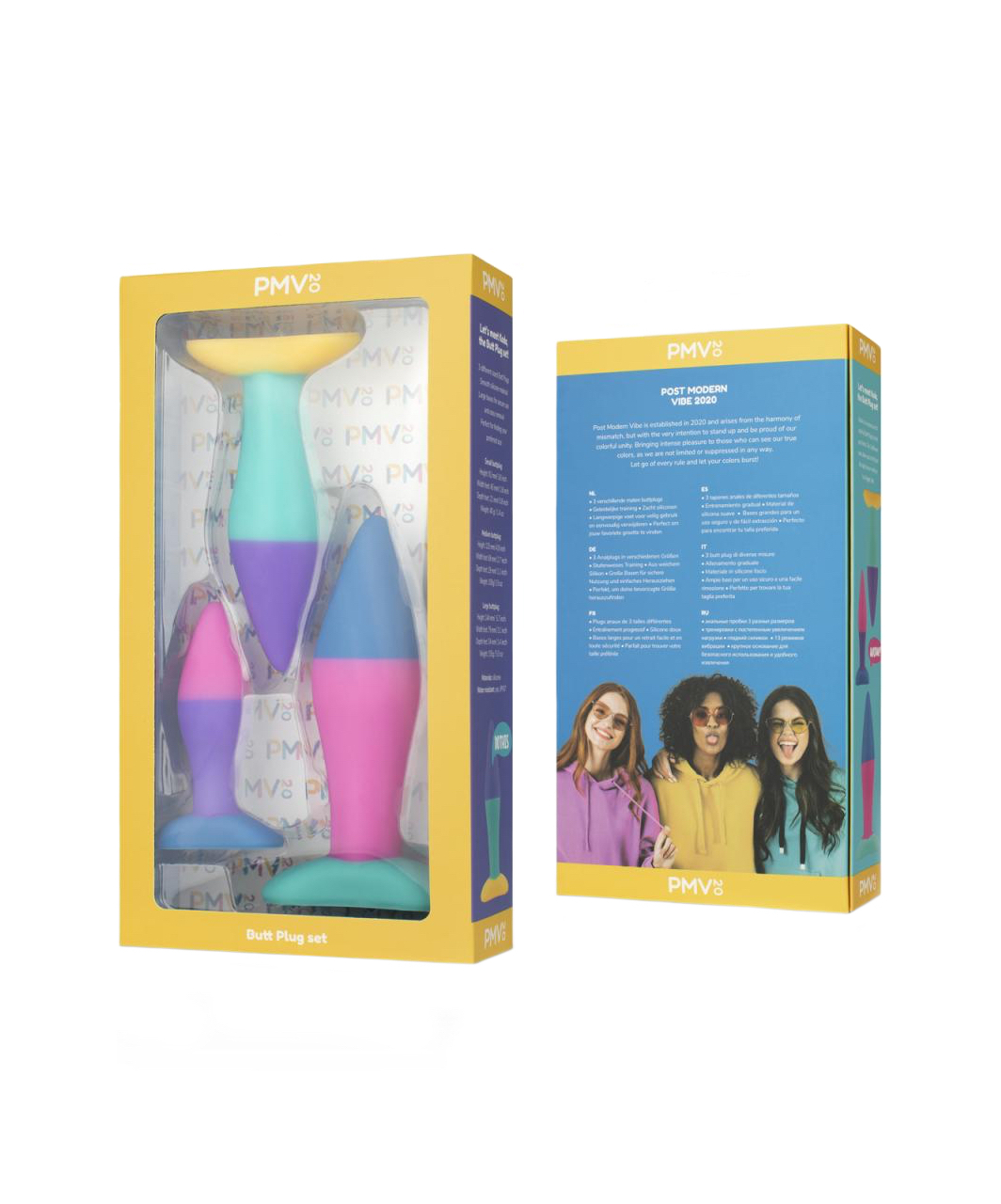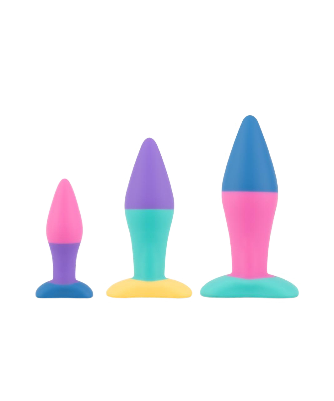 Kolmen värikkään ja asteittain kasvavan kokoisen pyllytulpan harjoittelusarja. Jokainen tulppa on valmistettu joustavasta, erittäin pehmeästä ja kehoystävällisestä materiaalista. Helppokäyttöinen kartiomaisen muotonsa ansiosta.