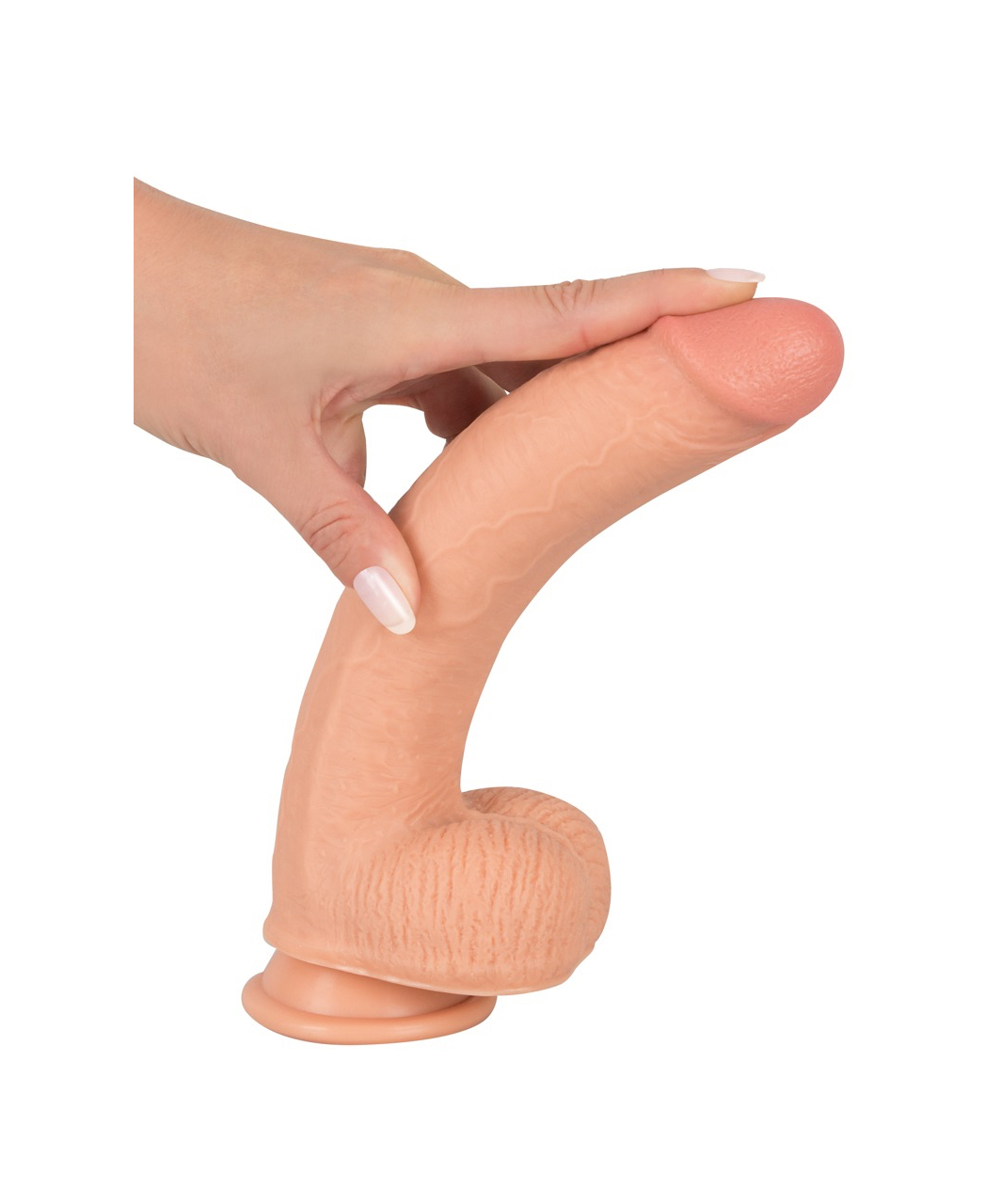 Hihanvärinen sileä ja saumaton silikonidildo, jossa on pirteät kivekset, pullistuvat vaaleanpunaiset glanssit ja imukuppipohja, jonka avulla dildo voidaan kiinnittää sileään pintaan ja nauttia soolotoiminnasta. Dildo on sisältä miellyttävän kiinteä, joustava ja siinä on ihoa muistuttava rakenne, joka tuntuu poikkeuksellisen elävältä ja näyttää myös aidolta! Yhteensopiva valjaiden kanssa ja sopii täydellisesti villiin pegging-hauskanpitoon. Pitkäkestoisen nautinnon saamiseksi käytä vain vesipohjaisia liukuvoiteita. Puhdista miedolla saippualla lämpimässä vedessä tai käytä seksilelujen puhdistusainetta.