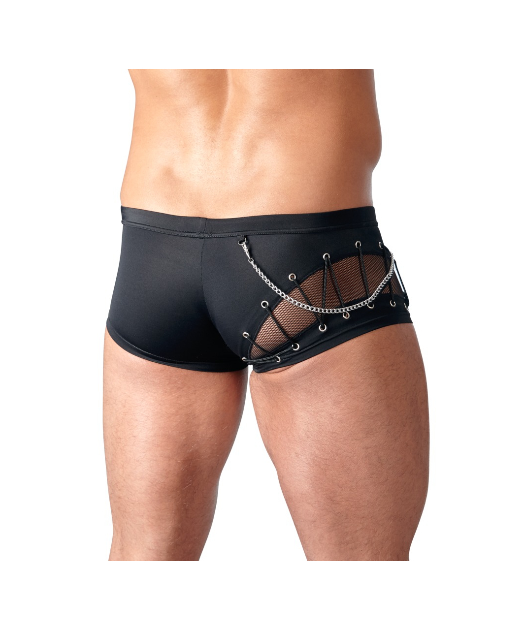 Mustat joustavat housut, jotka on valmistettu trendikkäästä läpinäkymättömän ja verkkomateriaalin yhdistelmästä. Irrotettavalla metalliketjulla, koristeellisella nyörityksellä ja vetoketjulla edessä.