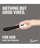 Tämä silkkisen pehmeä tyylikäs musta vibraattori stimuloi G-pistettä, jolloin voit keskittyä täysin nautinnon tutkimiseen. Valitse suosikkisi 30 eri värähtelytilasta ja löydä uusia tuntemuksia! Vibraattorissa on hieman taivutettu akseli, joka on suunniteltu erityisesti G-pisteen stimulointiin, kun taas kevyesti harjattu rakenne lisää intensiteettiä. Ota se mukaan myös suihkuun - lelu on roiskevesitiivis.