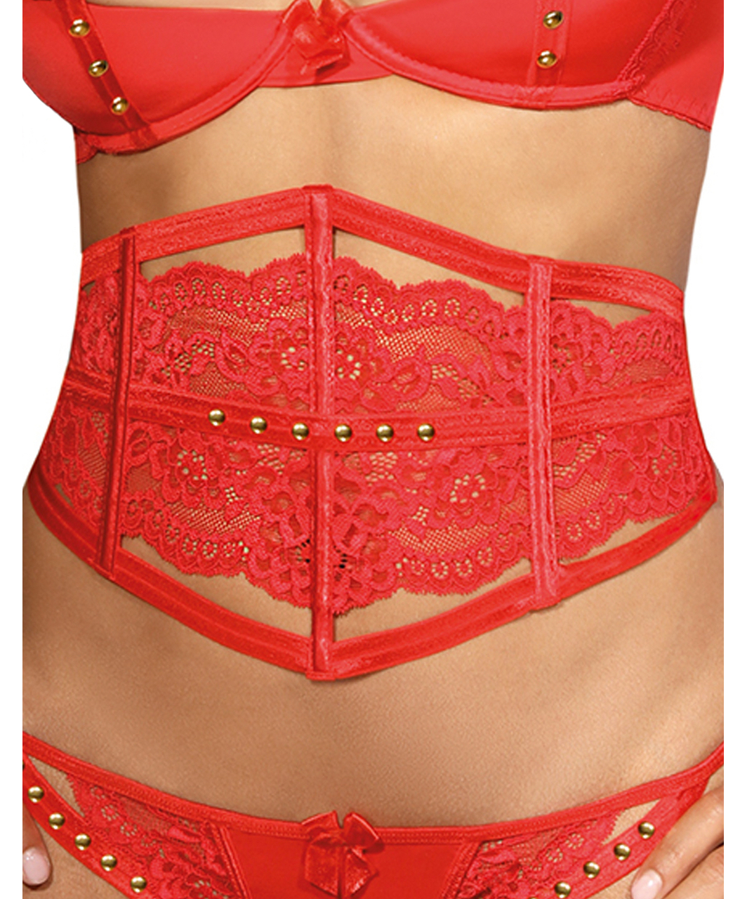 Raudonas dekoratyvinis juosmens korsetas su nėriniais ir aukso spalvos detalėmis. Reguliuojamas užsegimas kabliuku ir kilpa.