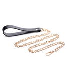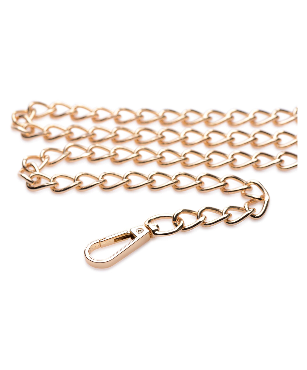 Metalinis aukso spalvos grandininis pavadėlis su užtrauktuku ir juoda odine kilpa rankai.