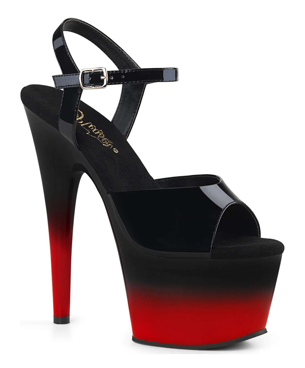 Juodos lakuotos odos per kulkšnį suveržiamos basutės atvirais kojų pirštais, aukšta dviejų atspalvių platforma, smailiu kulnu ir su mikropluošto vidpadžiu.