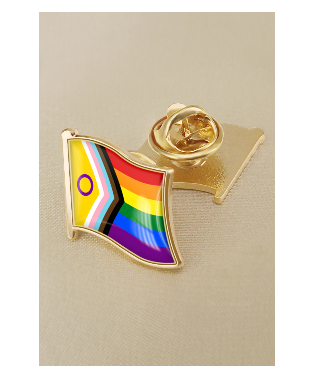 Blizgus LGBT pažangos vėliavos aukso spalvos atlapo ženkliukas. Lengvas, su užsegimu "Buterfly".