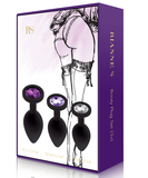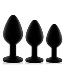 Juodas spalvos silikono analinių stimuliatorių komplektas, puoštas žvilgančiais, dekoratyviais akmenukais. Komplekte yra trys skirtingų matmenų stimuliatoriai, kurie idealiai pritaikyti treniruotės gerinimui. Dar malonesniems pojūčiams naudokite kartu su lubrikantu. Gaminys supakuotas gražioje violetinėje dėžutėje su aksomo juostele.