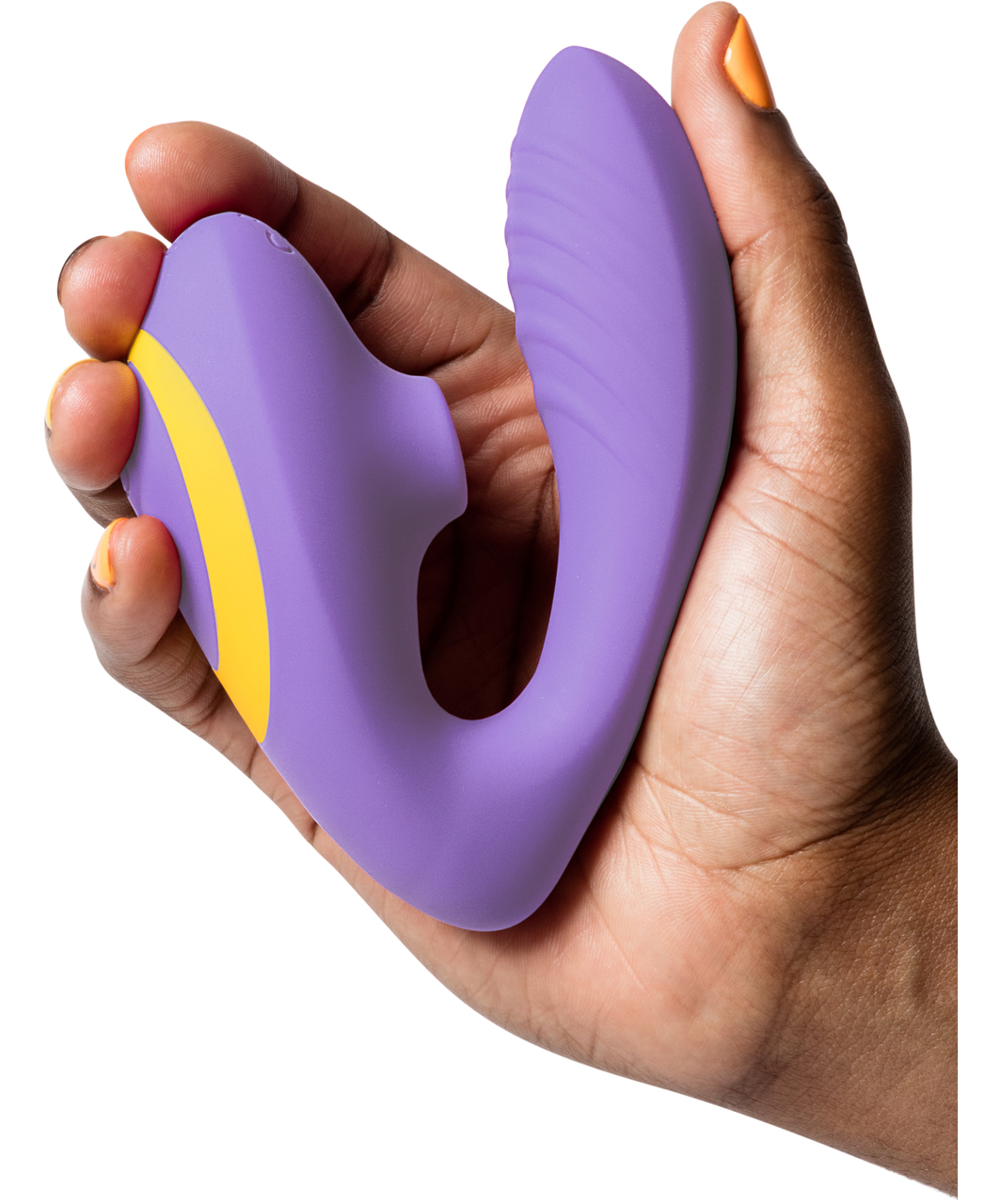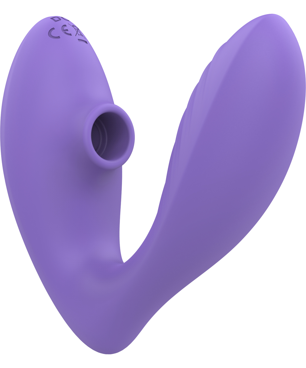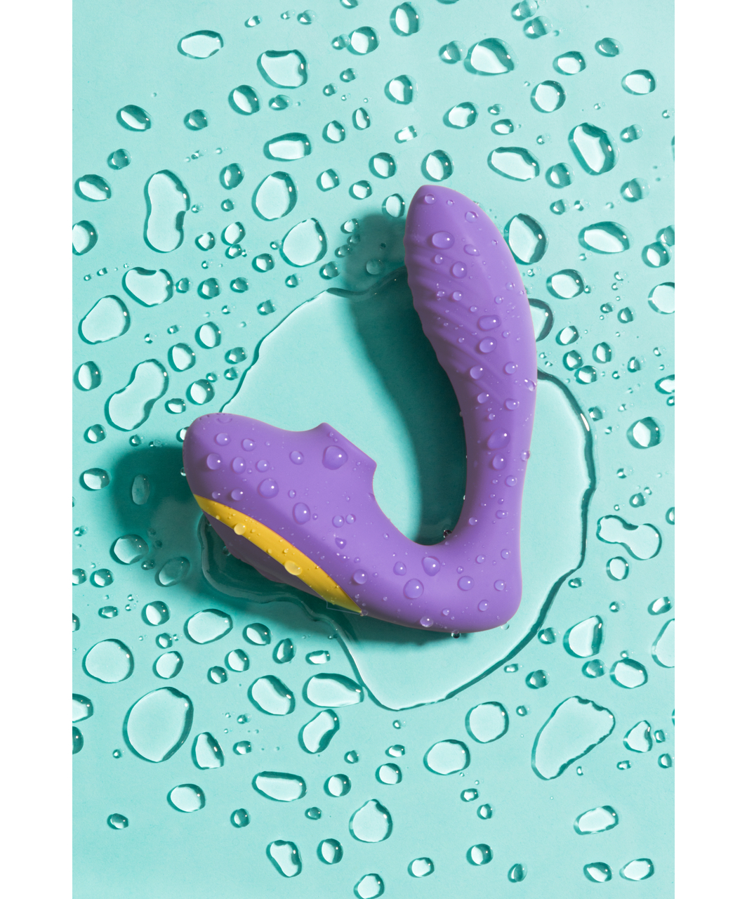 Susipažinkite su naujuoju dvigubos stimuliacijos vibratoriumi iš ROMP! Jis pagamintas iš violetinės spalvos, švelnaus silikono, turi vidinį vibruojantį G taško stimuliatorių ir Pleasure Air technologijos klitorio siurbimo galvutę. Pleasure Air technologija švelniai glostys klitorį 10 siurbimo intensyvumų, o griovelių vibratorius stimuliuos G tašką 3 vibracijos intensyvumais ir 7 modeliais. Išbandykite jį ir vonioje ar duše, nes jis visiškai atsparus vandeniui. Žaislas turi kelionės užrakto funkciją, kuri užtikrina saugų jo gabenimą keliaujant - paspauskite abu mygtukus ir palaikykite juos 3 sekundes, kad įjungtumėte ir išjungtumėte užrakto funkciją.