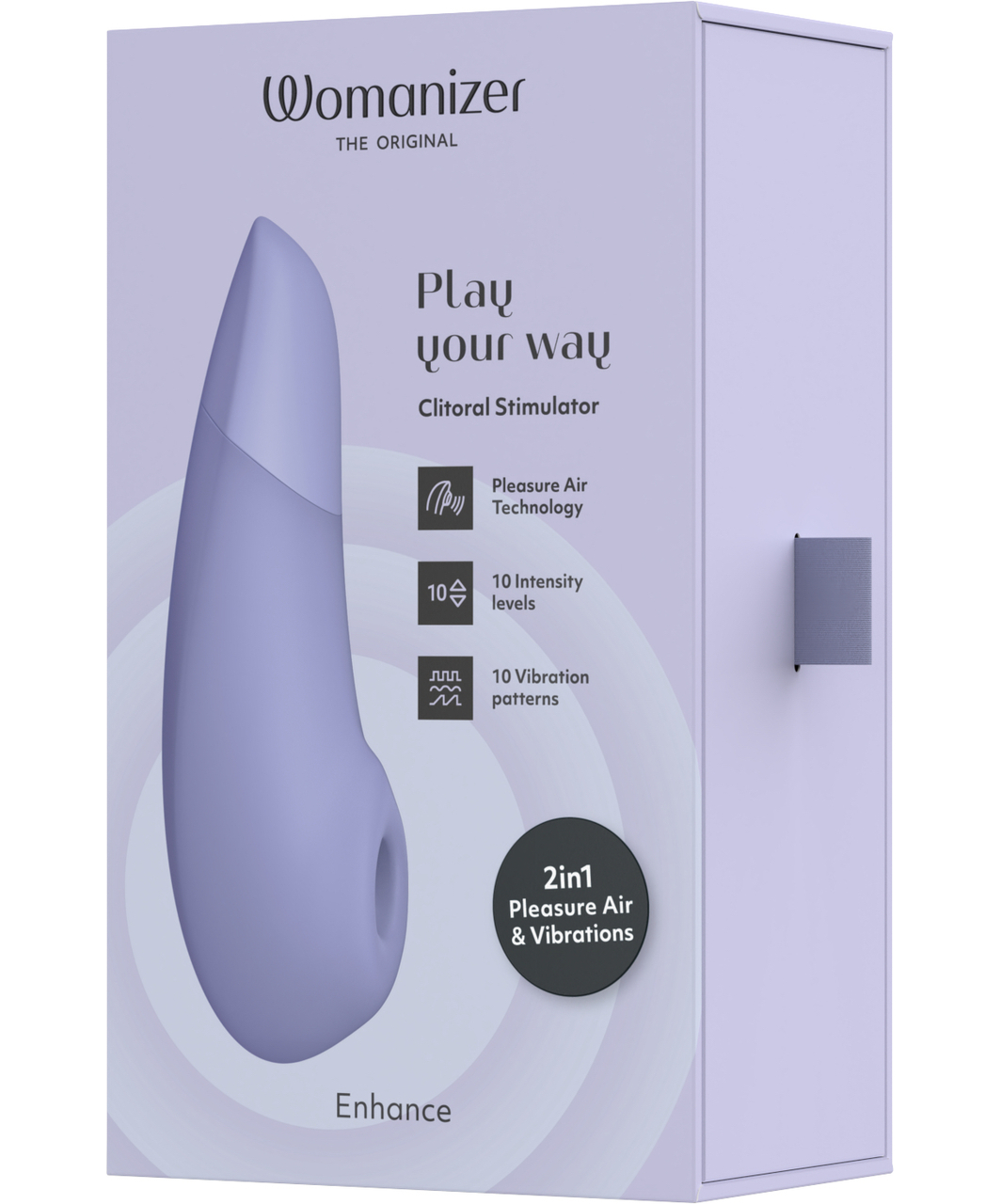 Violetinė$ 186,25Naujausias "Pleasure Air" stimuliatorių asortimento papildymas - "Womanizer Enhance" - siūlo daugiau nei 1000 malonumų derinių. Šis lengvai naudojamas, lengvas ir šilkinio švelnumo stimuliatorius yra "Womanizer" meistriškumo ir technologijų viršūnė, pasižymintis garsiuoju "Pleasure Air" ir dundančia vibracija. "Enhance" sukurtas nepaliaujamiems orgazminiams malonumams, užtikrinantis 10 vibracijos ritmų, 10 vibracijos intensyvumų ir 10 "Pleasure Air" intensyvumų mišriai klitorio palaimai!