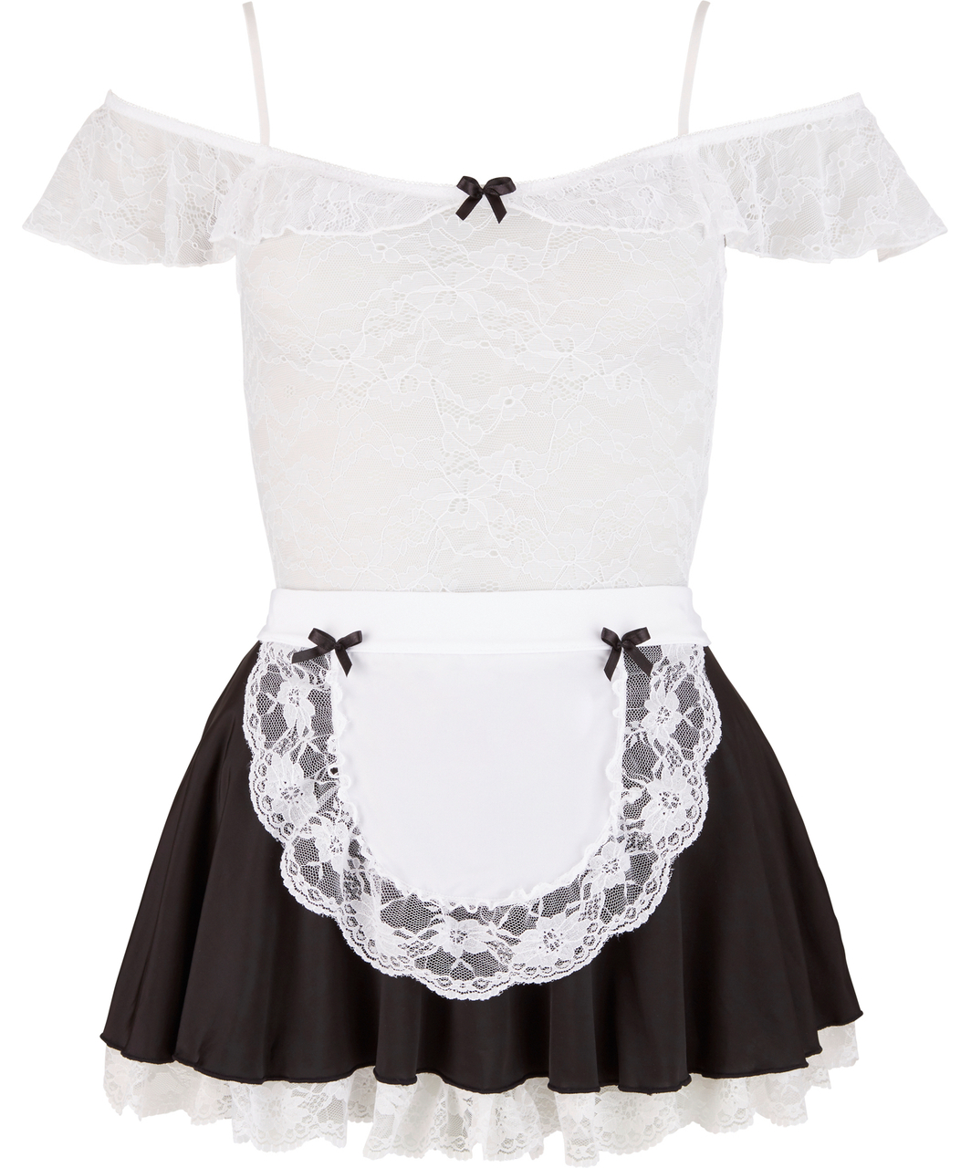 Iejūties kārdinošās viesmīles, draiskās kalpones vai izveicīgās istabenes lomā! Pavedinoša minikleita ar baltu, mežģīņainu augšdaļu un pieskaņotu priekšautu.