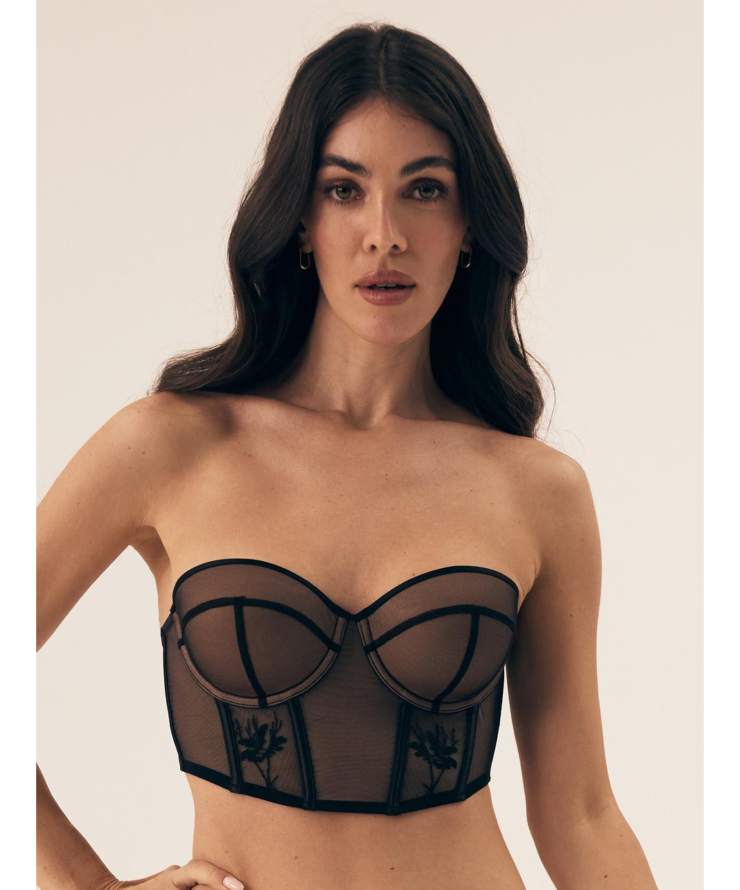 Melna, caurspīdīga tīkliņauduma krūšturis ar polsterētēm, miesas krāsas bļodiņām. Rotāts ar ziedu izšuvumu pagarinājuma daļā. Lencītes ir noņemamas un to garums ir ērti maināms. Krūšturim ir trīs rindu āķīšu aizdare mugurpusē.