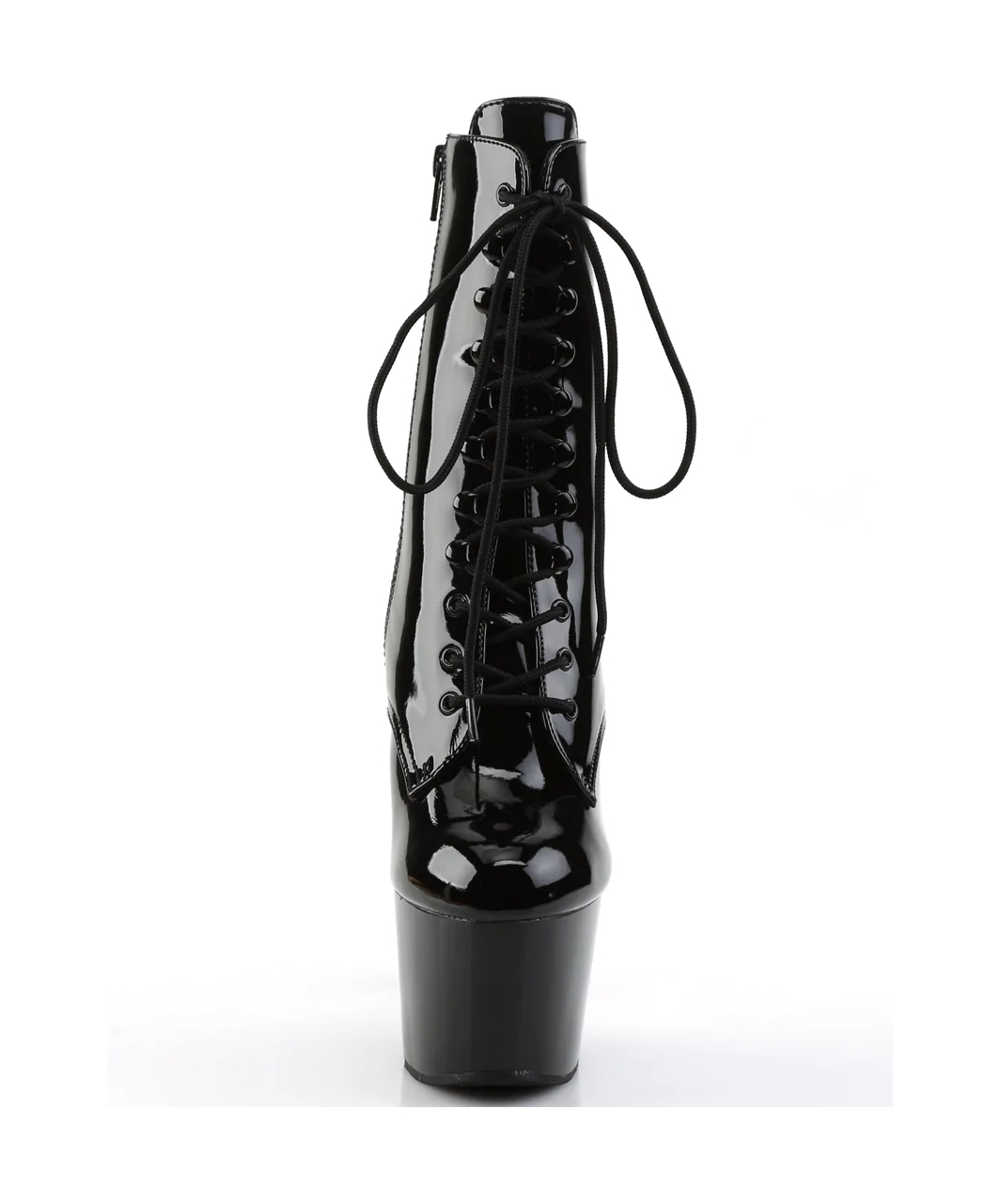 Melni lakādas augstpapēžu zābaki ar augstu platformu, šņorējumu, rāvējslēdzēju iekšpusē un vinila saistzoli.