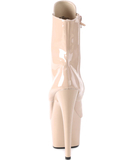 Smilškrāsas lakādas augstpapēžu zābaki ar augstu platformu, šņorējumu, rāvējslēdzēju iekšpusē un vinila saistzoli.