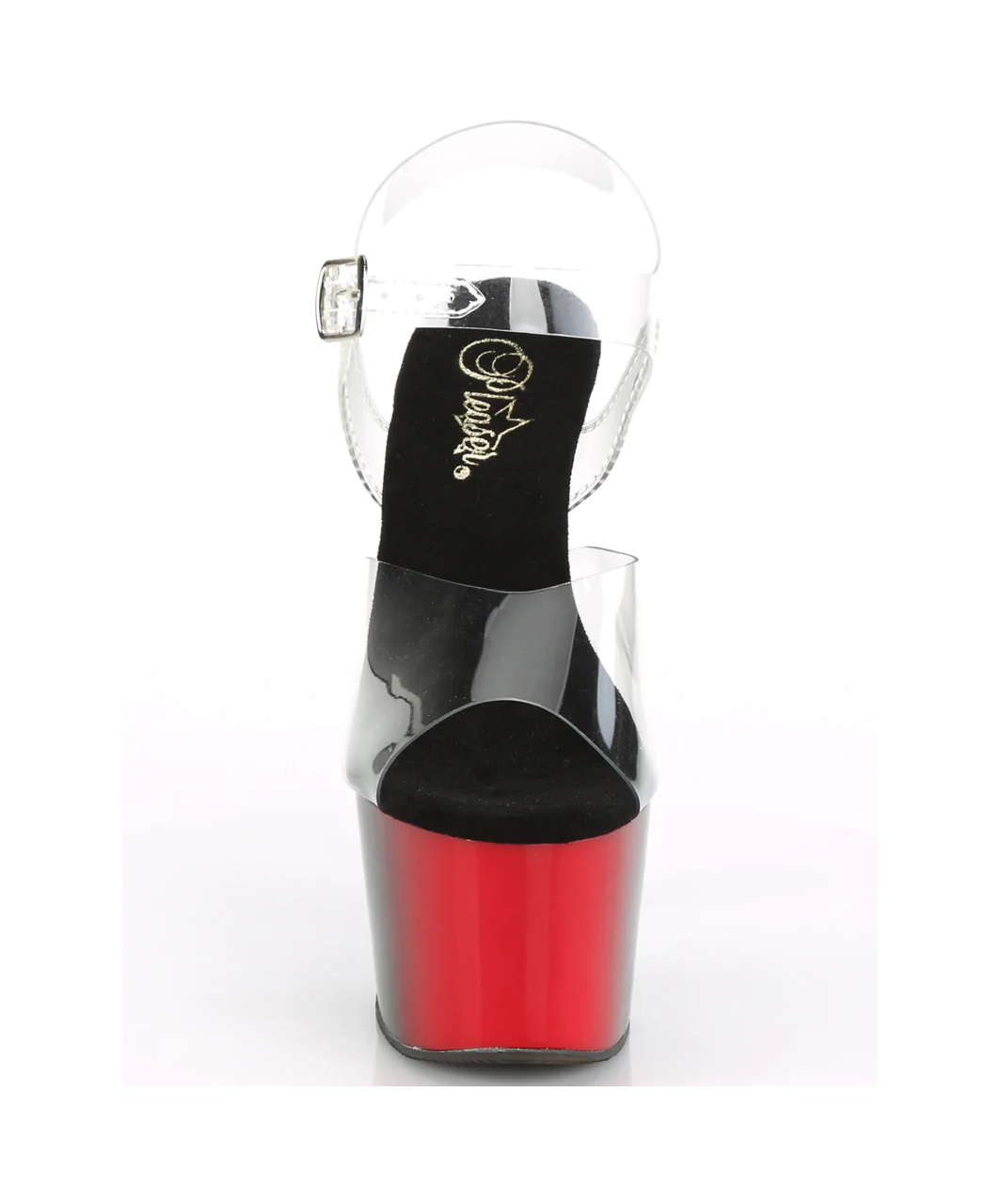 Augstpapēžu kurpes ar augstu sarkanmelnu platformu, caurspīdīgu vinila virsu, mikrošķiedras saistzoli un atvērtu purngalu.