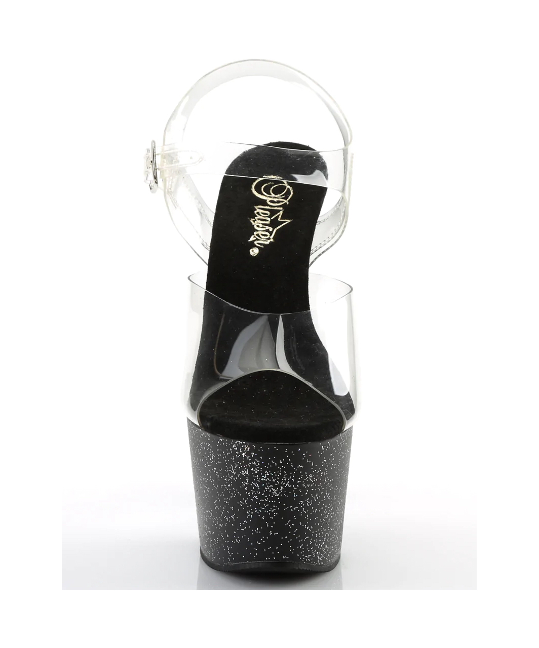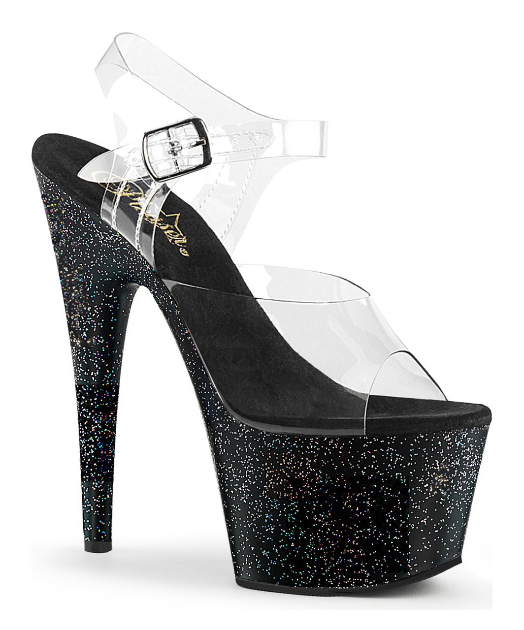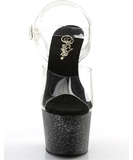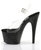 Augstpapēžu kurpes ar augstu melnu platformu ar smalkiem zaigojošiem spīguļiem, caurspīdīgu vinila virsu, mikrošķiedras saistzoli un atvērtu purngalu.