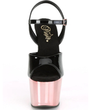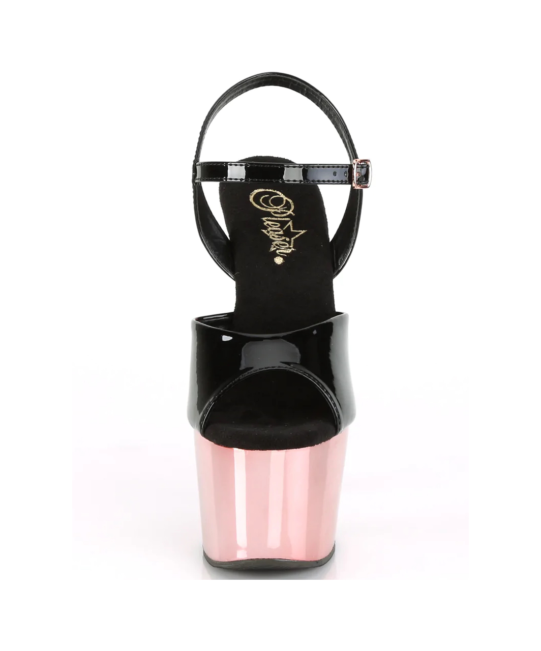 Melnas lakādas augstpapēžu kurpes ar augstu zeltaini rozā hromētu platformu, mikrošķiedras saistzoli un atvērtu purngalu.