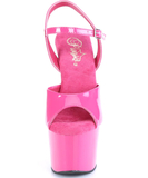 Rozā lakādas augstpapēžu kurpes ar augstu platformu, mikrošķiedras saistzoli un atvērtu purngalu.