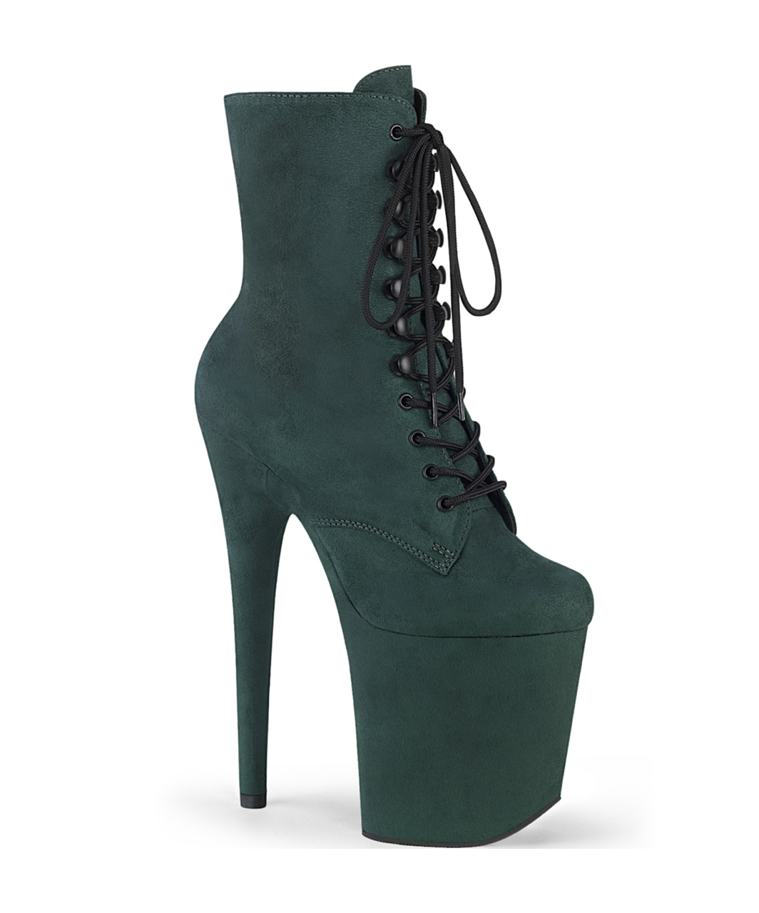 Tumši zaļi mākslīgās zamšādas augstpapēžu zābaki ar ļoti augstu platformu, šņorējumu, rāvējslēdzēju iekšpusē un vinila saistzoli.