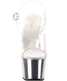 Augstpapēžu kurpes ar augstu sudrabaini hromētu platformu, caurspīdīgu vinila virsu, mikrošķiedras saistzoli un atvērtu purngalu.