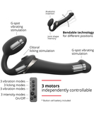 Melns, tvirts, bezsiksnu strap-on vibrators ar motoriem abās daļās, kā arī kustīgu ‘mēlīti’ klitora stimulatoru. Katru motoru un klitora stimulatoru var ieslēgt atsevišķi un izvēlēties tīkamo stimulāciju – 3 ritmus un 3 intensitātes – ar tālvadības pulti, kas darbojas līdz 10 m attālumā. Vibrators ir darināts no zīdaini gluda un ķermenim draudzīga materiāla, ar iekšējo šarnīru stieni, kas ļauj pielāgot rotaļlietu vēlamajā leņķī. Izbaudiet kopā arī vannā vai dušā, jo rotaļlieta ir pilnībā ūdensizturīga!