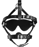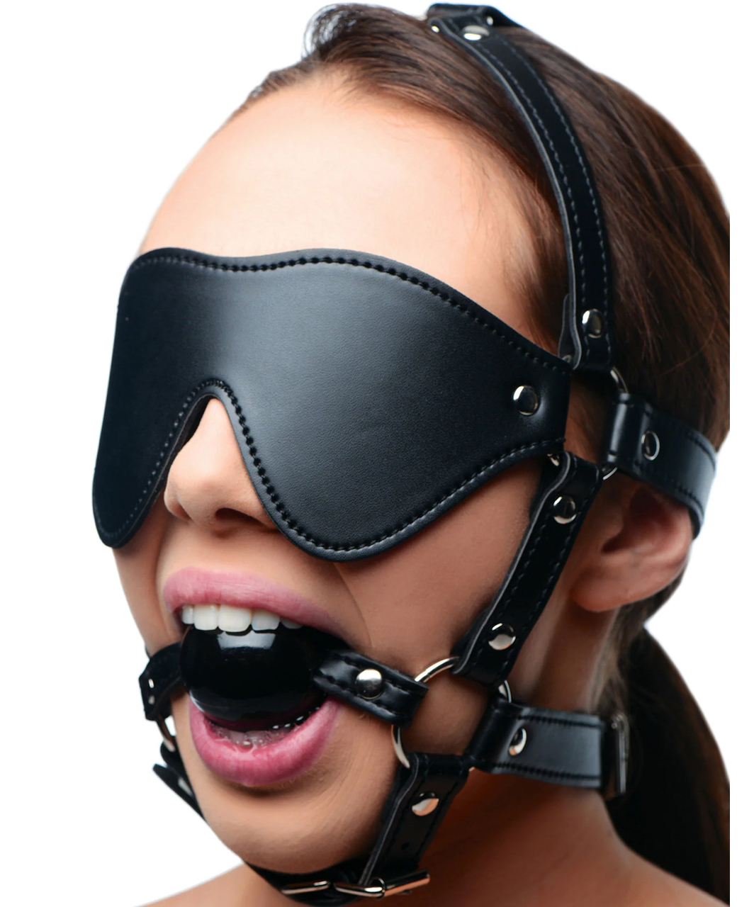 Ta uprząż na głowę ma paski ze sztucznej skóry z dołączonym solidnym kneblem kulkowym i opaską na oczy. Paski są regulowane za pomocą sprzączek.