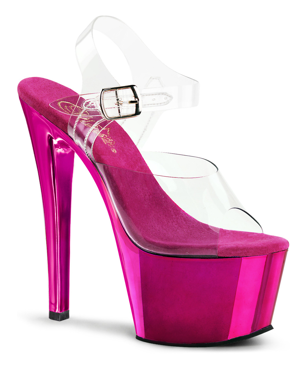 Przezroczyste winylowe sandały z odkrytymi palcami i paskiem na kostkę z wysoką różową chromowaną platformą, obcasem na szpilce i wkładką z mikrofibry.
