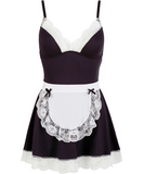Классический и соблазнительный образ французской горничной! Черное мини-платье с регулируемыми бретелями и слегка расклешенной юбкой. Белое кружево на подоле и в области декольте. Белый фартук с кружевом, декоративными бантами и завязками.